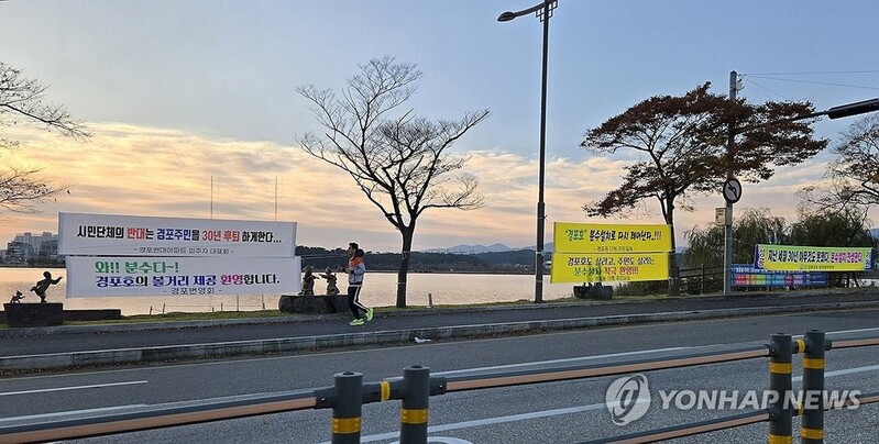 | ▲ 경포호 둘러친 분수 설치 찬성 현수막 [연합뉴스 자료사진] |