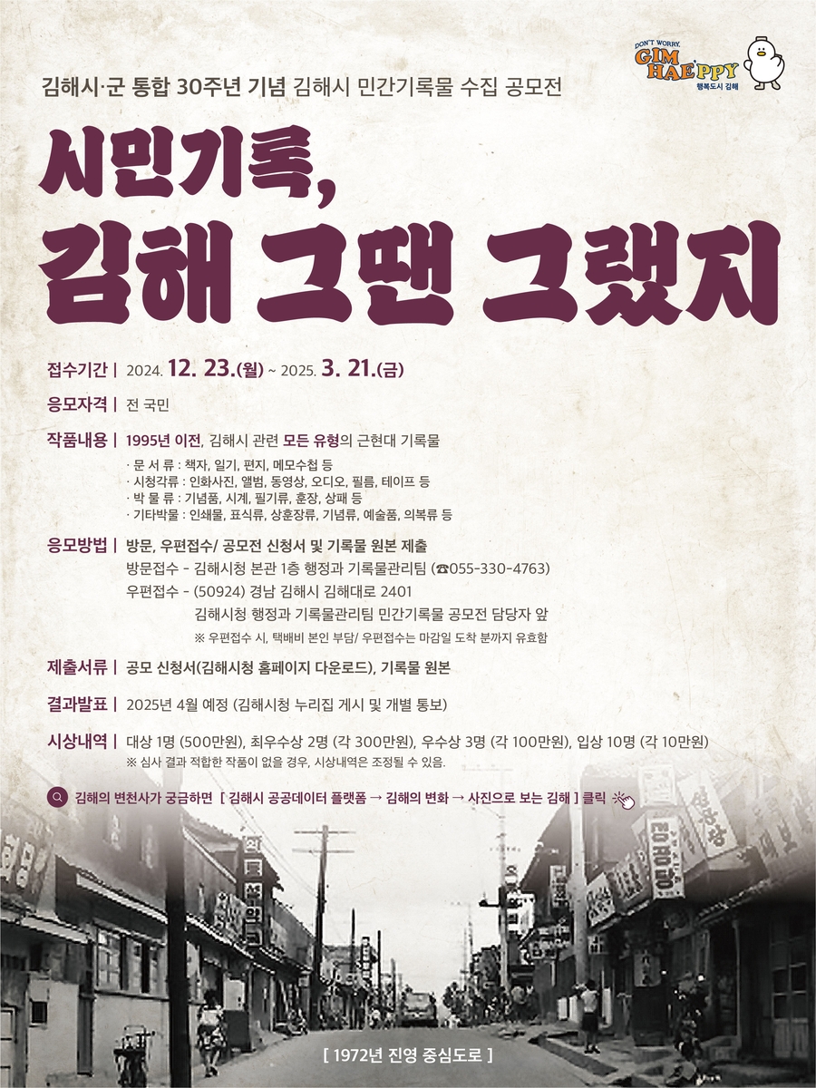 (김해=연합뉴스) 최병길 기자 = 시군 통합 30주년을 맞는 경남 김해시는 오는 23일부터 내년 3월 21일까지 시 민간기록물 공모전 '시민기록, 김해 그땐 그랬지'를 전 국민을 대상으로 공모한다고 19일 밝혔다.