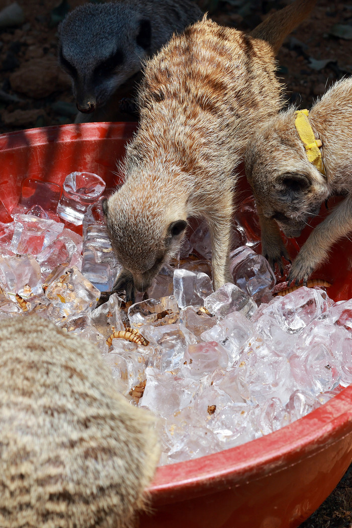 Animals in hot weather Meerkats eat ice blocks with mealworms in the hot summer weather at a zoo in Seoul on July 10, 2025. (Yonhap)(END)