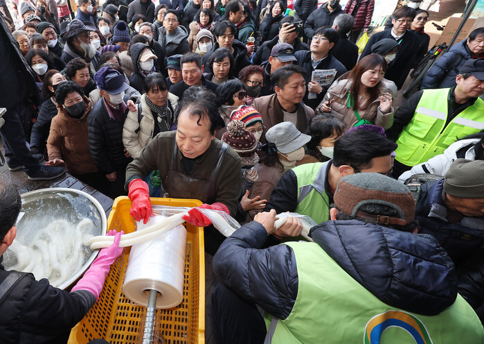 Customers and shopkeepers join hands in making 180-meter-long "garaetteok," a Korean rice cake stick, during a New Year event at a traditional Korean market in the city of Suwon, south of Seoul, on Jan. 16, 2026. (Yonhap)