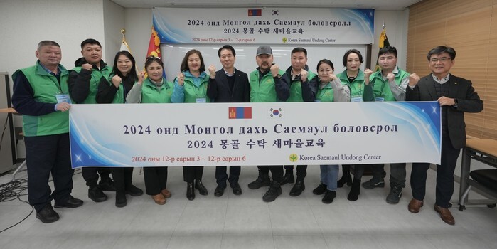 Officials from Mongolia pose during a ceremony to start their Saemaul Undong education at the Korea Saemaul Undong Center in Seongnam, south of Seoul, on Dec. 4, 2024, in this photo released by the center. Saemaul Undong is Korea's rural development movement initiated by President Park Chung-hee in the 1970s. (PHOTO NOT FOR SALE) (Yonhap)