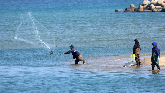 A resident casts a fishing net to catch gray mullet in waters on the estuary of a stream in Gangneung, a seaside town in South Korea's northeastern province of Gangwon, on Feb. 26, 2025. (Yonhap)