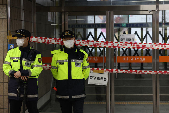Police officers stand guard at the entrance of a closed subway station near the Constitutional Court in Seoul on April 2, 2025, two days before the court hands down a decision on whether to remove impeached President Yoon Suk Yeol from office or reinstate him over his brief imposition of martial law in early December. (Yonhap)