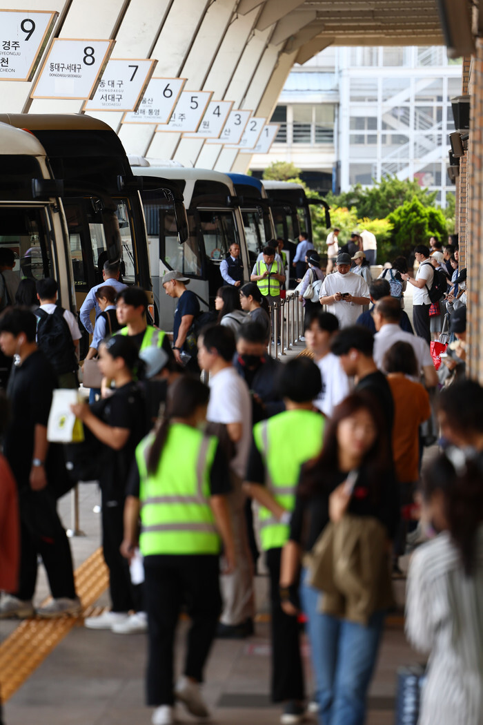 Holidaymakers board buses at Seoul Express Bus Terminal to travel outside the capital to their hometowns on Oct. 2, 2025, the eve of a seven-day break for Chuseok, the Korean harvest holiday that falls on Oct. 6 this year and is a time for family reunions, with Koreans traditionally offering a ritual feast to their ancestors on Aug. 15 of the lunar calendar. (Yonhap)