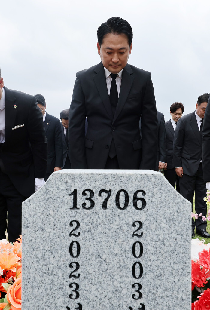 Jang Dong-hyeok, leader of the main opposition People Power Party, visits the grave of Marine Cpl. Chae Su-geun at the National Cemetery in the central city of Daejeon on Sept. 24, 2025. Chae was swept away by a torrent in a stream during a search operation for civilians missing amid heavy rains in July 2023. (Yonhap)
