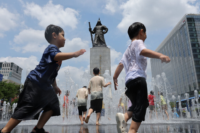 Children play in a fountain near the statue of Adm. Yi Sun-shin in Gwanghwamun, central Seoul, on June 8, 2025. (Yonhap)