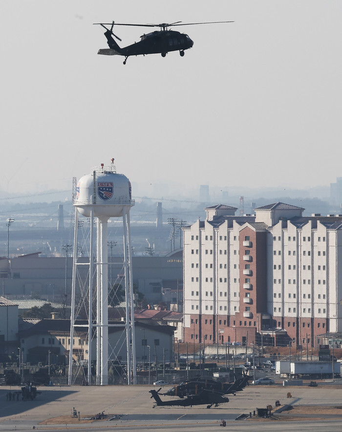 A UH-60 Black Hawk helicopter lands at U.S. Camp Humphreys in Pyeongtaek, south of Seoul, on Dec. 18, 2025, a day after the U.S. Senate passed an annual defense policy bill that includes a measure to restrict the government from unilaterally reducing the current troop level of the 28,500-strong U.S. Forces Korea. (Yonhap)
