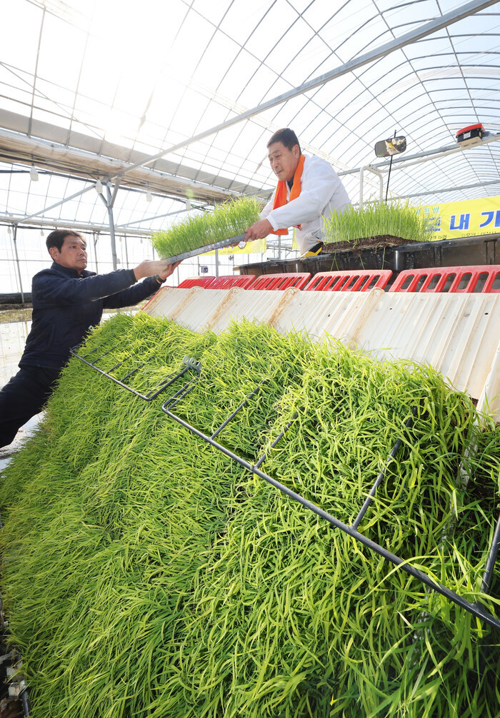 Farmers load rice seedlings onto a machine to plant them inside a greenhouse in Icheon, about 50 kilometers southeast of Seoul, on Feb. 13, 2025, during a ceremony to start planting Royal Grade Icheon Rice for the first time in the country this year. (Yonhap)