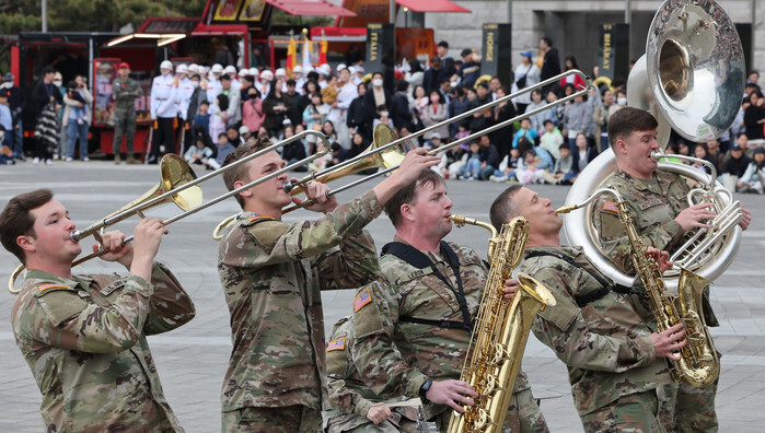 Visitors watch the U.S. Eighth Army's brass band performing at the War Memorial of Korea in Seoul on May 5, 2025, the Children's Day national holiday. (Yonhap)