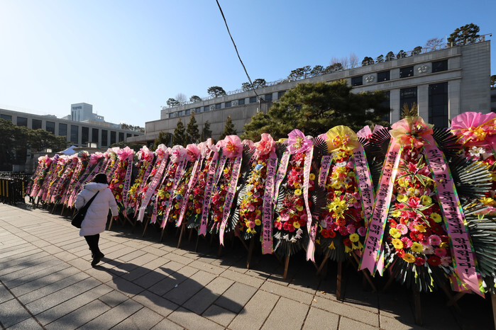 Wreaths sent by supporters of President Yoon Suk Yeol are lined up outside the Constitutional Court in Seoul on Dec. 19, 2024, expressing their opposition to Yoon's impeachment over his martial law declaration. (Yonhap)