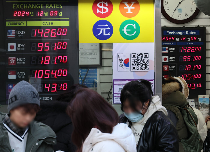 An electronic board in Seoul shows the Korean won-dollar exchange rate rising to 1,426 on Dec. 9, 2024, amid political uncertainties following the scrapped parliamentary vote on the impeachment of President Yoon Suk Yeol. The rate briefly surpassed the 1,430 mark during the trading session earlier in the day. (Yonhap)