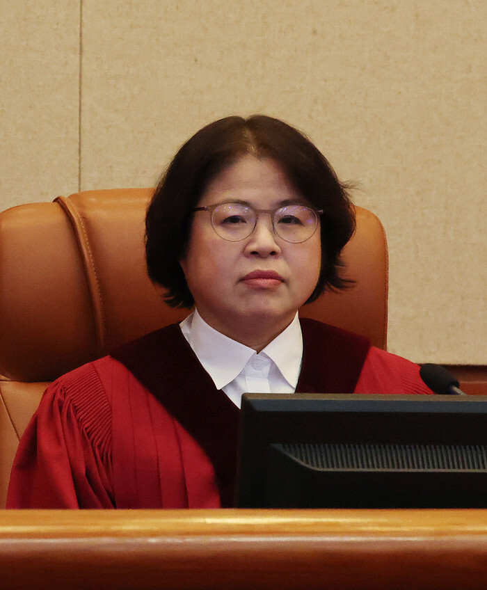 Kim Bok-hyeong, a justice of the Constitutional Court, is seated at the court in Seoul on Jan. 14, 2025, to attend the first formal hearing of President Yoon Suk Yeol's impeachment trial over his short-lived imposition of martial law, with Yoon absent from the proceedings out of safety concerns. (Pool photo) (Yonhap)