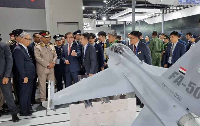 This photo, provided by the state-run Korea Aerospace Industries Ltd. (KAI), shows KAI President Kang Goo-young (3rd from L) explaining the South Korean-made FA-50 fighter to Egyptian Defense Minister Abdel Mageed Saqr (2nd from L) at the Egypt International Airshow at El Alamein International Airport in the namesake city on Sept. 3, 2024. (PHOTO NOT FOR SALE) (Yonhap)