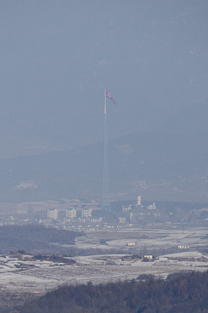 A North Korean flag flies in the North's Kijong Village on the western border with South Korea, in this photo taken from an observatory in the South Korean border city of Paju on Jan. 7, 2025, after North Korea claimed the same day it has successfully launched a new type of intermediate-range hypersonic missile. (Yonhap)