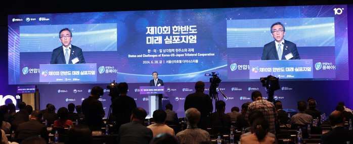Foreign Minister Cho Tae-yul delivers a keynote speech at an annual Korean Peninsula symposium, titled "The Status and Challenges of Korea-U.S.-Japan Trilateral Cooperation," in Seoul on June 28, 2024. Yonhap News Agency and the unification ministry co-organized the event. (Yonhap)