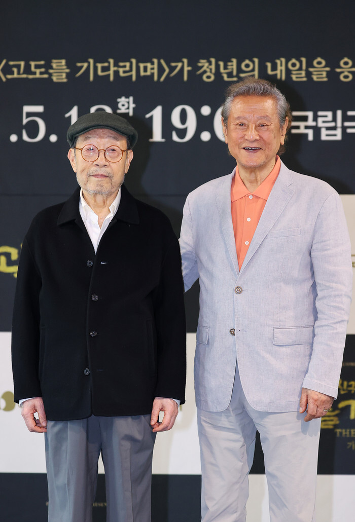 South Korean actors Park Geun-hyung (R) and Shin Koo, who star in the new play "Waiting for Godot, The Final," pose for a photo during a publicity event in Seoul on April 23, 2025. The play will run from May 9 to May 25. (Yonhap)