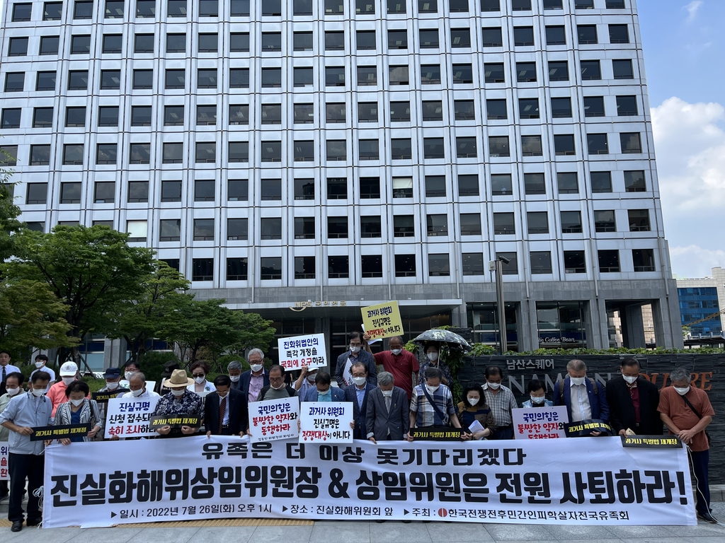유족회는 26일 오후 서울 중구 진실화해위 건물 앞에서 기자회견을 열어 "민간인 학살 신청 9천여 건 중 조사 의결된 게 1.1%에 못 미친다"며 "총체적 '진실규명 불능 위원회'의 모습만 남았다"고 비판했다.