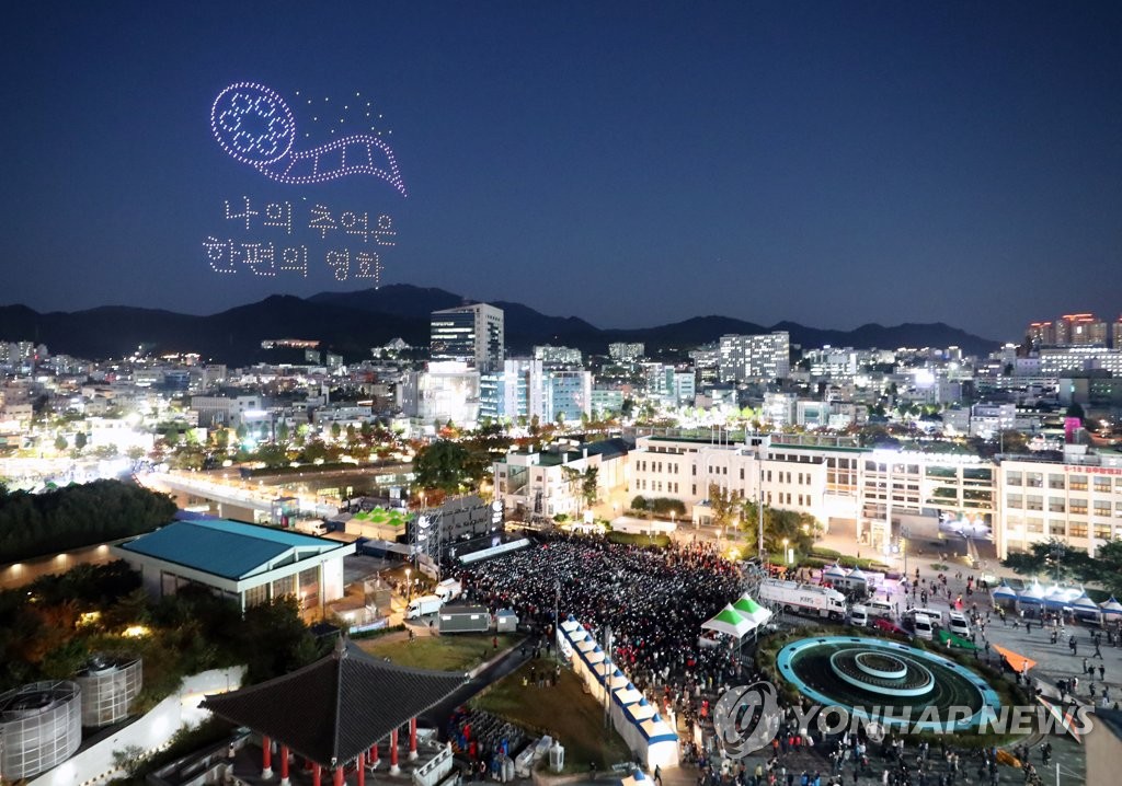 | ▲ 광주 충장축제 드론 쇼 (광주=연합뉴스) 천정인 기자 = 제19회 추억의 광주충장 월드페스티벌(축제)이 개막한 13일 오후 광주 동구 5·18 민주광장에서 드론쇼가 펼쳐지고 있다. 축제는 '나의 추억의 한편의 영화'를 주제로 17일까지 이어진다. 2022.10.13 iny@yna.co.kr |