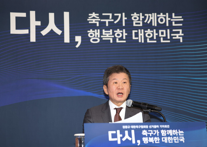Chung Mong-gyu, the three-term president of the Korea Football Association (KFA), holds a news conference at the KFA headquarters in Seoul on Dec. 19, 2024, to announce his candidacy for a fourth term as KFA president. (Yonhap)