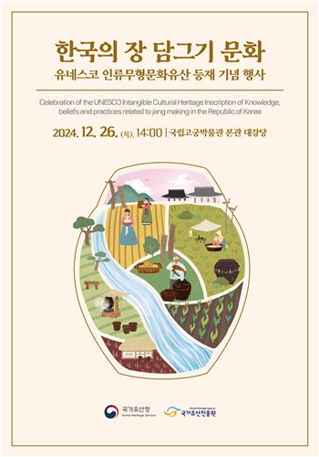 (서울=연합뉴스) 황희경 기자 = ▲ '장 담그기 문화' 유네스코 인류무형유산 등재 기념 행사 = 국가유산청과 국가유산진흥원은 26일 국립고궁박물관에서 '한국의 장 담그기 문화'의 유네스코 인류무형유산 대표목록 등재를 기념하는 행사를 연다고 18일 밝혔다.