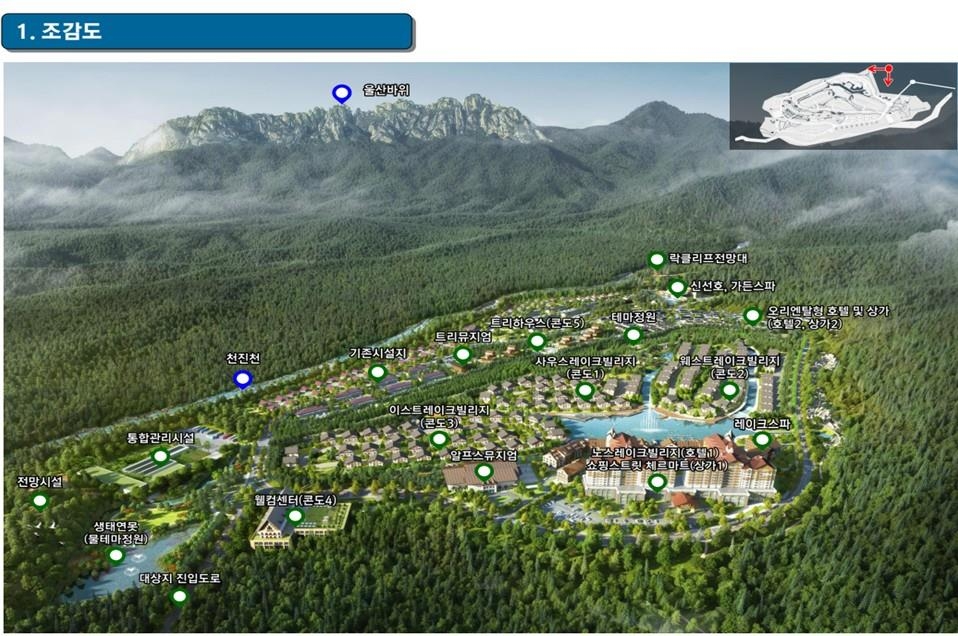 자연 친화형 관광숙박시설(1천677실 규모)을 비롯해 온천과 뮤지엄, 전망대 등 다양한 부대시설이 들어선다.