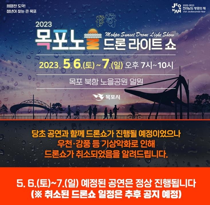 (목포=연합뉴스) 조근영 기자 = '2023 목포노을 드론라이트쇼'가 오는 6~7일로 연기됐다.