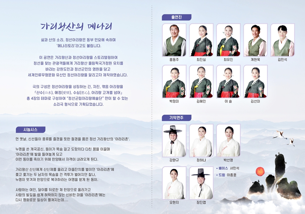 (정선=연합뉴스) 배연호 기자 = 정선군립아리랑예술단은 아라리촌을 배경으로 제작한 소리극 '가리왕산의 메나리'를 8일 강원 정선아리랑센터 아리랑홀에서 선보인다고 5일 밝혔다.