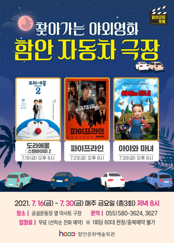 함안문화예술회관은 7월 16, 23, 30일 금요일 오후 8시 총 3회에 걸쳐 야외자동차 극장인 '함안 자동차 극장'을 운영한다.