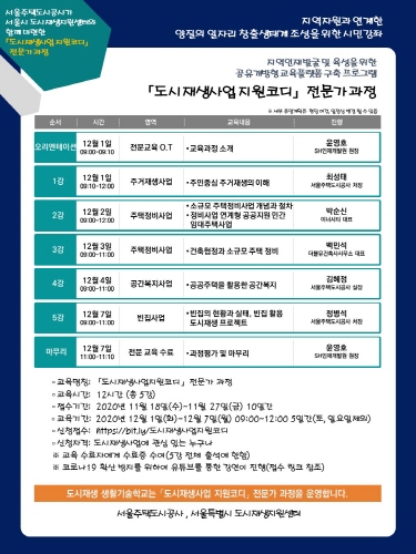 '도시재생사업 지원 코디' 전문가 과정은 서울특별시 도시재생지원센터와 함께 마련한 교육과정으로, 12월 1일부터 7일까지 5일간(토, 일요일 제외) 오전 9시부터 12시까지 강의 당 2∼3시간씩 총 5회(12시간) 진행한다.