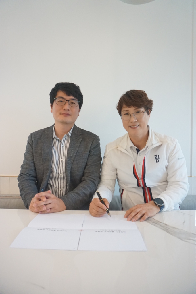 | ▲ 매니지먼트 계약에 서명하는 한정원(오른쪽) [더팬커뮤니케이션 제공. 재판매 및 DB 금지] |