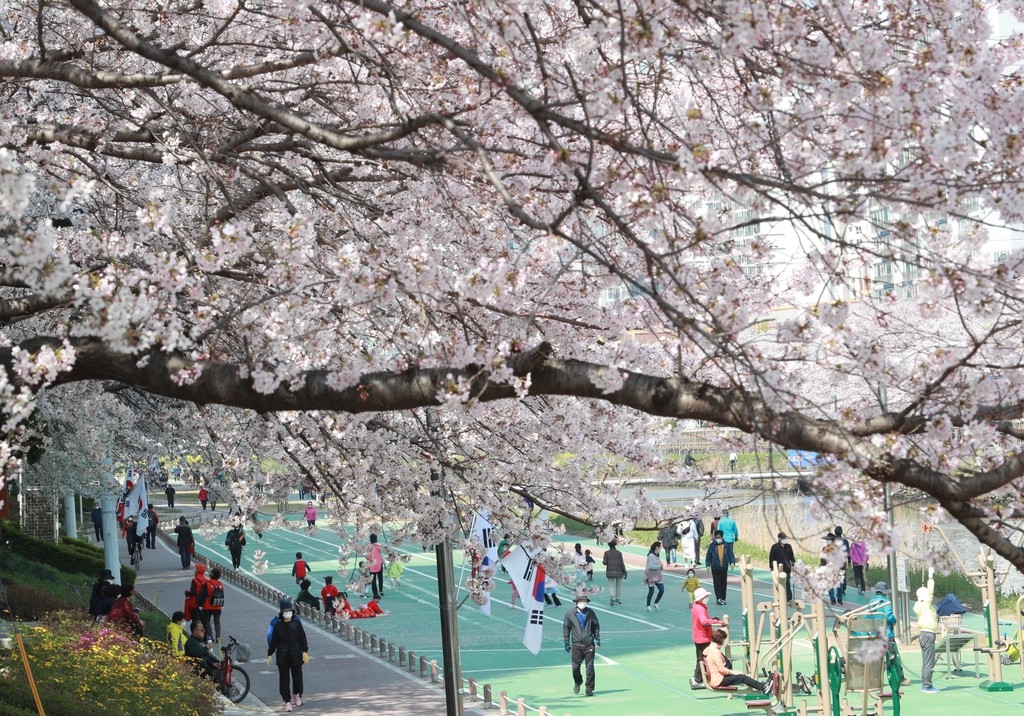 이날 벚꽃이 80% 이상 개화한 부산 온천천시민공원은 평일이라 당장 코로나19 확산이 우려되는 정도 인파는 아니었지만, 산책로와 카페거리 곳곳이 인파로 북적였다.