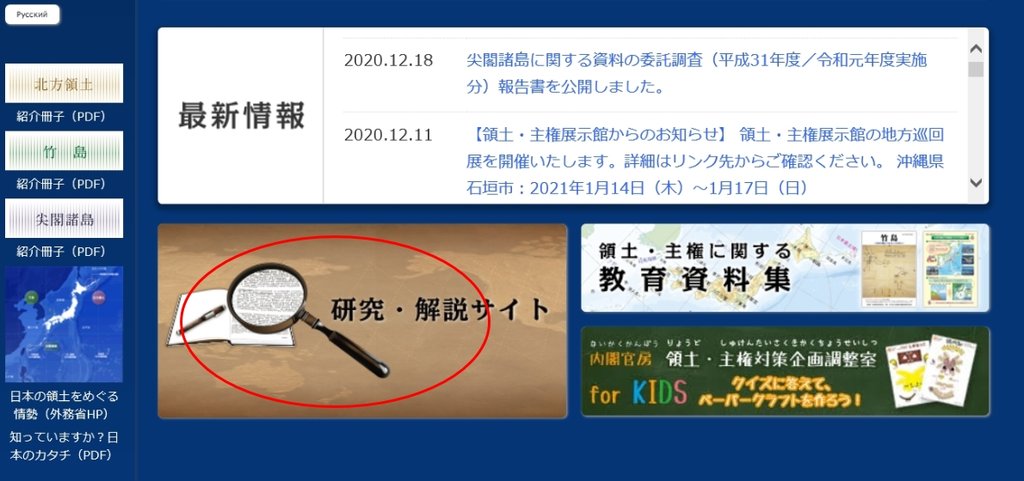 | ▲ 독도 연구 해설 사이트 추가된 내각관방 홈페이지 (도쿄=연합뉴스) 일본 내각부 소속 기관인 내각관방의 '영토·주권' 홈페이지에 추가된 '연구·해설 사이트' 배너. 지난해 12월 센카쿠열도에 이어 올해 1월 29일 독도 관련 '연구·해설 사이트'가 추가됐다. 2021.1.31 [일본 내각관방 홈페이지 캡처. 재판매 및 DB금지] photo@yna.co.kr |