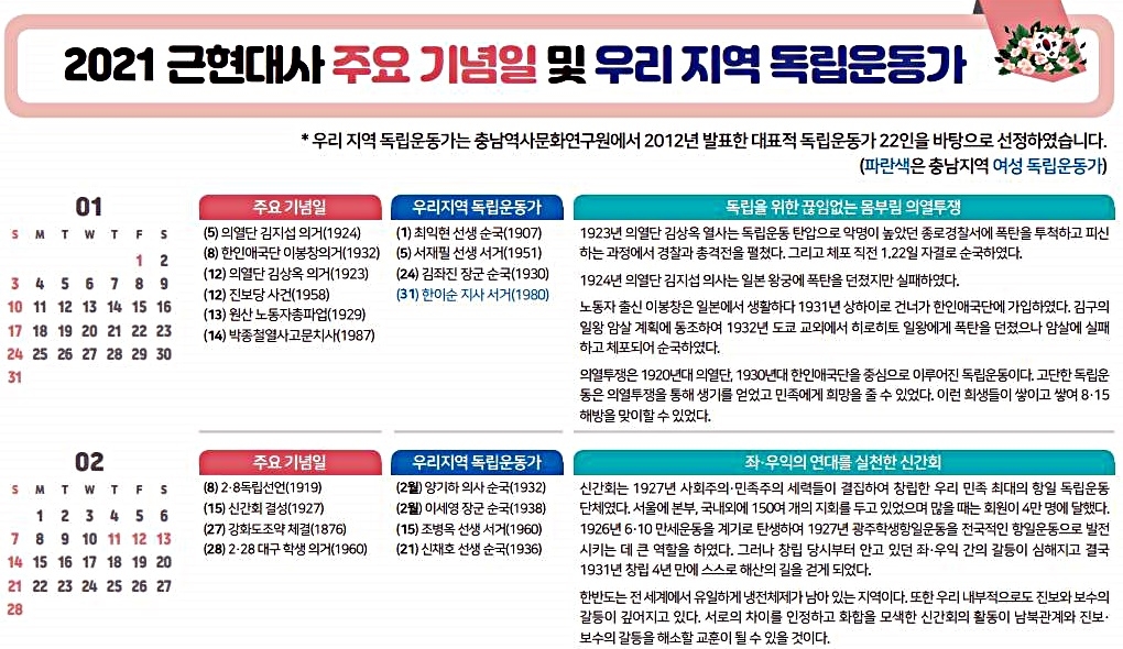역사달력은 개항 이후 근대에서 현대에 이르기까지 중요한 역사적 기념일을 월별로 연도를 알 수 있도록 정리하고, 지역 대표 독립운동가 30명의 순국일을 월별로 표기했다.