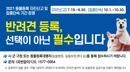 시는 이번 자진신고 기간 동안 반려동물의 등록이나 변경 신고를 할 경우 과태료를 면제할 계획이며, 신고 기간 종료 후 10월 한 달간 집중 단속을 실시할 예정이다.