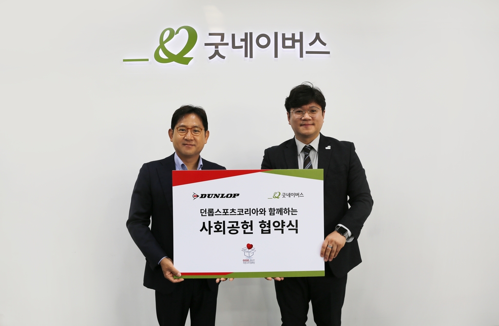 | ▲ 홍순성 대표(왼쪽)과 굿네이버스 황성주 나눔마케팅 본부장. [던롭 스포츠코리아 제공. 재판매 및 DB 금지] |