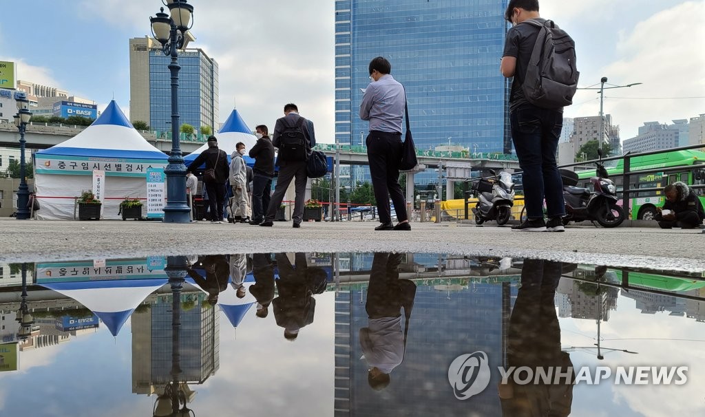 | ▲ People stand in line to get COVID-19 testing at a temporary screening station in front of Seoul Station on June 4, 2021. (Yonhap) |
