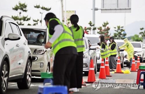 | ▲ "체온 스티커 붙여야 해수욕장 입장할 수 있습니다" (보령=연합뉴스) 지난 3일 충남 보령시 대천해수욕장 입구에 설치된 코로나19 검역소에서 해수욕장 운영 요원들이 승용차에 탄 입장객에게 코로나19 확산 방지용 체온 스티커를 건네는 모습. |