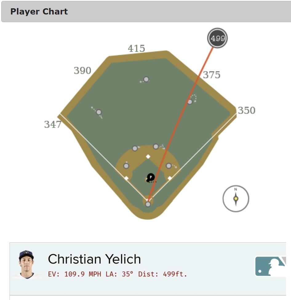 MLB 스탯캐스트가 측정한 옐리치의 홈런 비거리는 499피트(약 152m)였다.