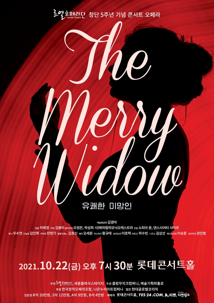 (서울=연합뉴스) 성도현 기자 = ▲ 르엘오페라단 '메리 위도우' = 르엘오페라단이 창단 5주년을 기념해 오는 22일 오후 7시 30분 송파구 롯데콘서트홀에서 프란츠 레하르의 오페레타(오페라보다 작은 규모의 음악극) '메리 위도우'를 무대에 올린다.