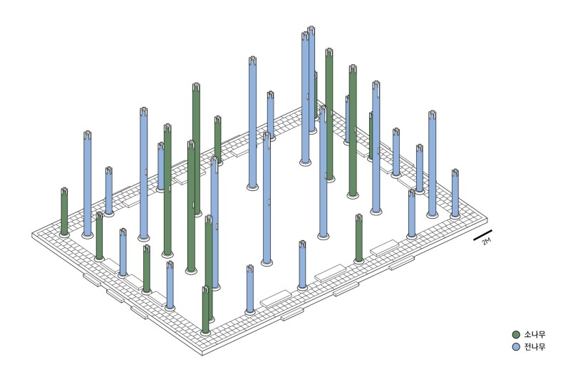 건물을 지지할 높은 나무 기둥을 곳곳에 세웠는데, 흥미롭게도 기둥의 수종(樹種·나무 종류)이 하나가 아니라 소나무와 전나무 두 가지다. 모두 소나뭇과에 속하는 침엽수인 두 나무의 차이점은 무엇일까.