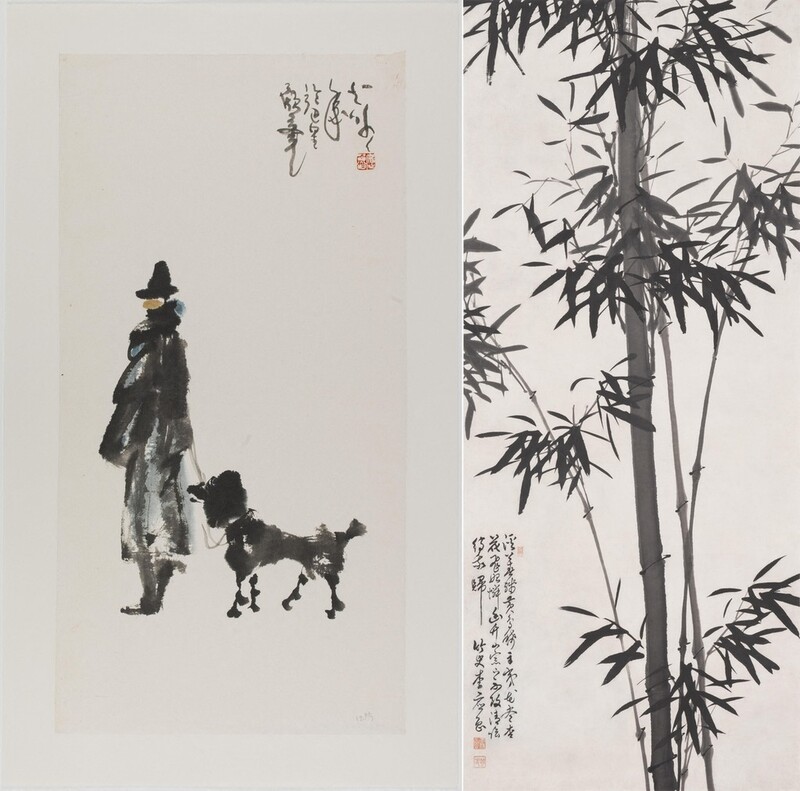 | ▲ 이응노, 파리 사람, 1976, 종이에 수묵, 66.2×34.2cm, 체르누스키 미술관, 파리 시립 아시아 미술관(왼쪽), 이응노, 대죽, 1932, 종이에 수묵, 161.5×68cm, 이응노미술관 소장[이응노미술관 제공. 재판매 및 DB 금지] |