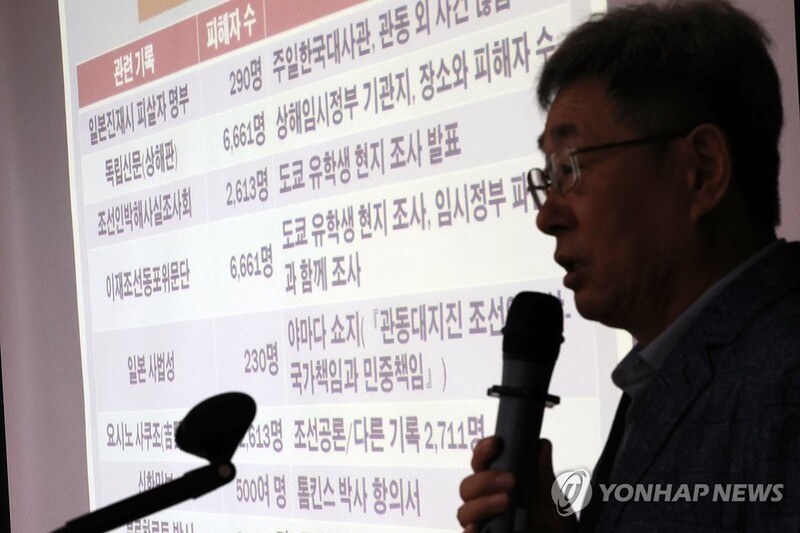 성주현 청암대 연구교수는 30일 서울 종로구 서울글로벌센터에서 열린 '관동(간토)대지진 조선인·중국인 학살 100년 : 진실·책임·기억' 학술회의에서 희생자 명부 현황을 설명하며 이같이 밝혔다.