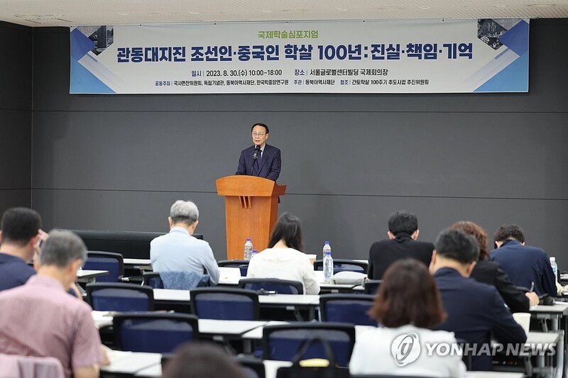 | ▲ 간토대지진 100주년 국제학술 심포지엄 (서울=연합뉴스) 김주성 기자 = 간토대지진 100주년을 맞아 30일 오후 서울 종로구 서울글로벌센터에서 '관동(간토)대지진 조선인·중국인 학살 100년 : 진실·책임·기억'을 주제로 국제학술 심포지엄이 열리고 있다. 이날 심포지엄은 동북아역사재단, 국사편찬위원회, 독립기념관, 한국학중앙연구원이 공동 주최했다. 2023.8.30 utzza@yna.co.kr |