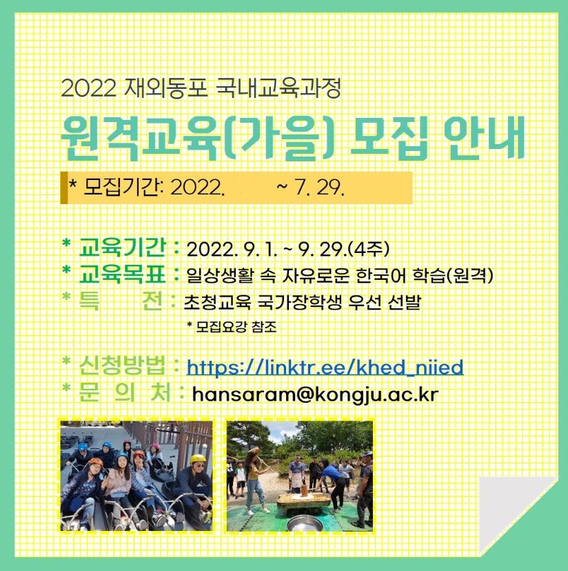 문화원 홈페이지(www.hansaram.or.kr)를 참조해 29일까지 이메일(hansaram@kongju.ac.kr)로 신청하면 된다.