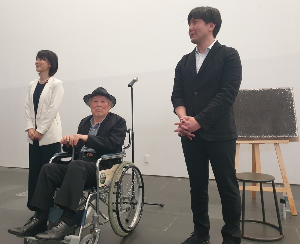 | ▲ (서울=연합뉴스) 황희경 기자 = 14일 오후 서울 국립현대미술관 서울관에서 열린 김구림 작가(가운데)의 퍼포먼스 '생성에서 소멸로' 재현을 마치고 퍼포머와 김 작가가 인사하는 모습. 2023.6.14. zitrone@yna.co.kr |