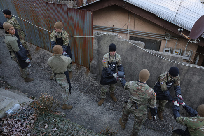 Soldiers with the 1st Stryker Brigade Combat Team under the 2nd U.S. Infantry Division in Dongducheon, 40 kilometers north of Seoul, carry coal briquettes to deliver them to impoverished local residents. (Yonhap)