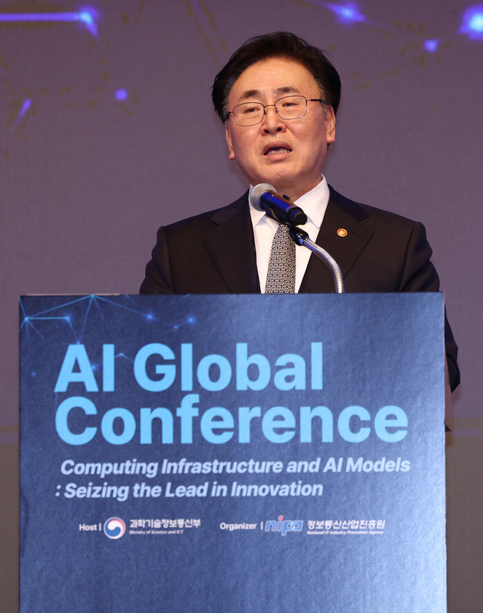 Science and ICT Minister Yoo Sang-im addresses a global conference on artificial intelligence (AI), hosted by the science ministry, at a Seoul hotel on March 25, 2025. (Yonhap)