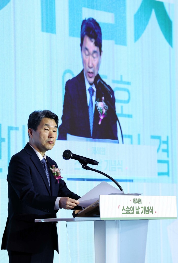 Acting President and Education Minister Lee Ju-ho speaks during a ceremony celebrating Teachers' Day in Seoul on May 15, 2025, to mark the special day. (Pool Photo) (Yonhap)