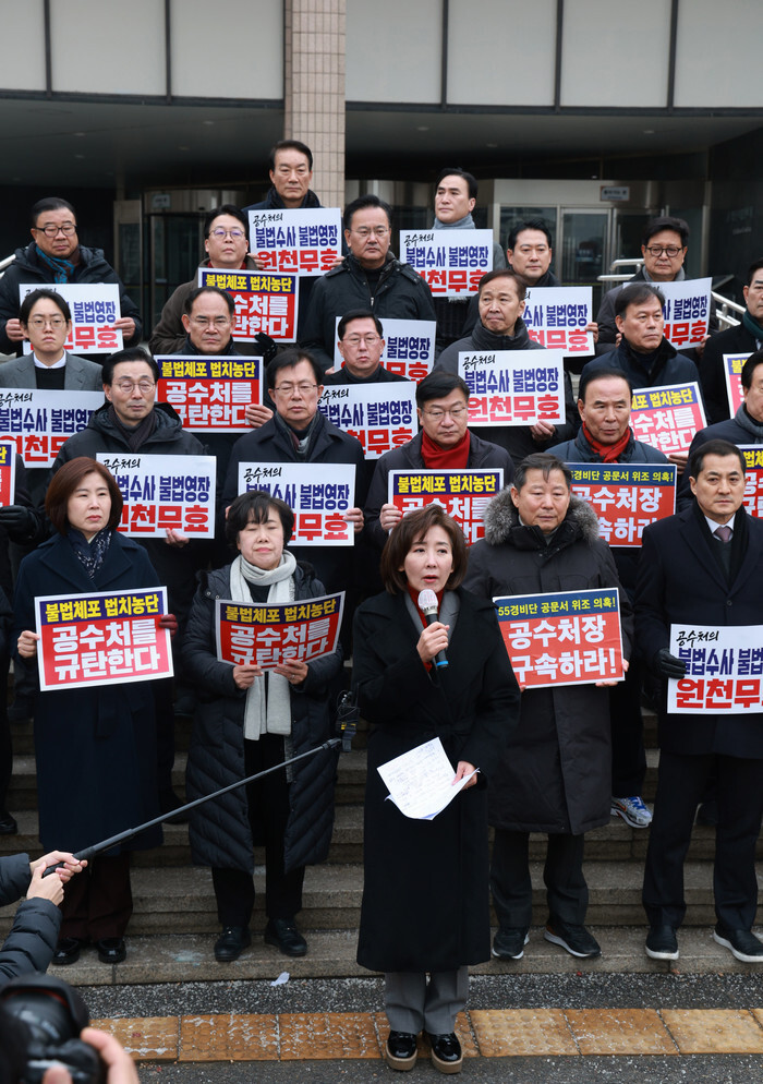Na Kyung-won (front) and other lawmakers of the ruling People Power Party rally in front of the Corruption Investigation Office for High-ranking Officials inside the government complex in Gwacheon, south of Seoul, on Jan. 16, 2025, one day after investigators from police and the anti-corruption agency executed a warrant to detain Yoon in connection with his short-lived imposition of martial law. (Yonhap)