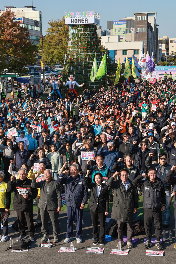 Members of the Korean Confederation of Trade Unions stage a protest rally in Gyeongju, North Gyeongsang Province, southeastern South Korea, on Oct. 29, 2025, to oppose U.S. President Donald Trump's state visit to South Korea. (Yonhap)